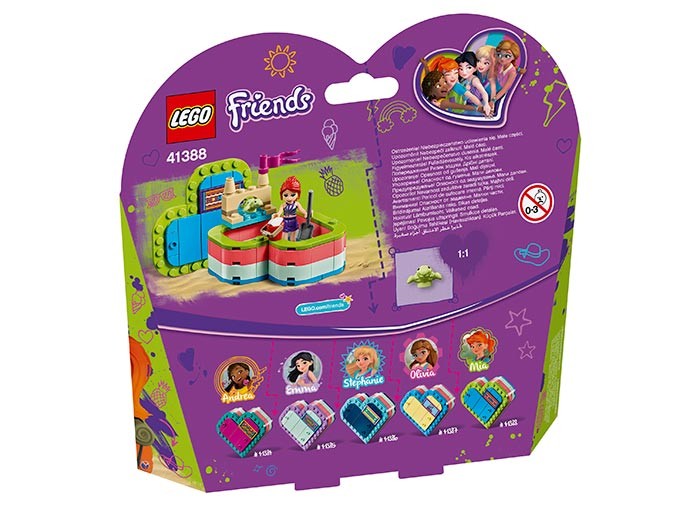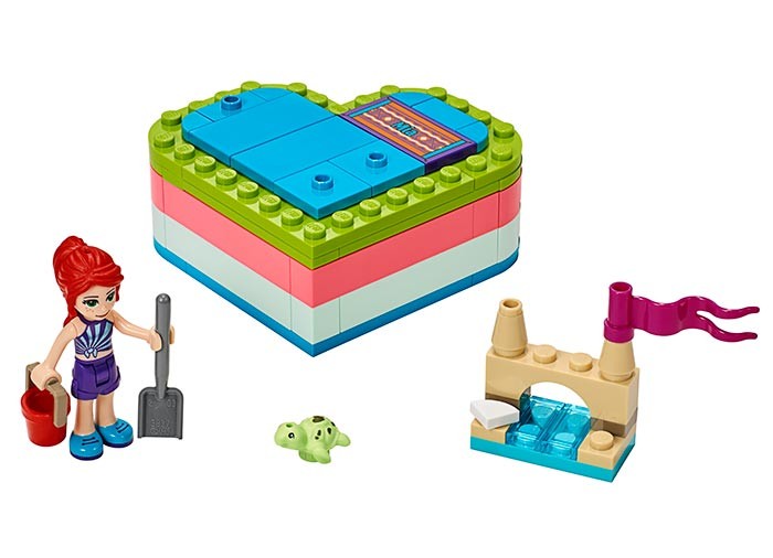 Mergi la plaja cu Mia LEGO Friends. Ajuta-o sa construiasca un castel de nisip pentru prietenul ei, puiul de testoasa, folosind galeata si lopata. Cerceteaza plaja LEGO pentru a gasi un steag de arborat pe turn, si o scoica pentru a decora intrarea. Dupa munca sustinuta din timpul zilei, ajuta prietenii sa se racoreasca in mare! Impacheteaza apoi toate elementele, si ia cu tine aceasta Cutie inima LEGO oriunde te-ai duce.