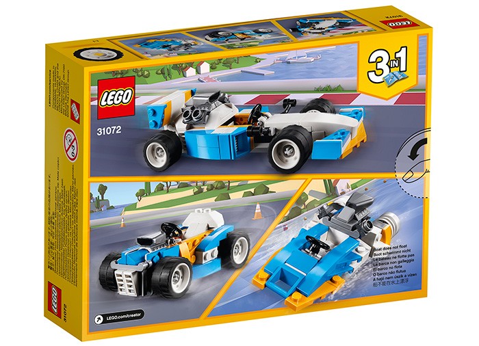 Urca in cabina Masinii de curse cu motorul sau posterior mare, prize de aer laterale, jante late cu pneuri cu profil jos si o schema de culori sportiva albastru, alb, galben si negru. Regleaza oglinzile laterale si deflectorul posterior pentru viteza maxima. Apoi ocupa-ti locul la linia de pornire si pregateste-te de cursa! Dupa ce termini, reconstruieste Masina de curse si porneste spre autodrom intr-o puternica Masina de curse ultra-rapida, sau incaleca valurile intr-o Barca cu motor super, castigatoare de curse.